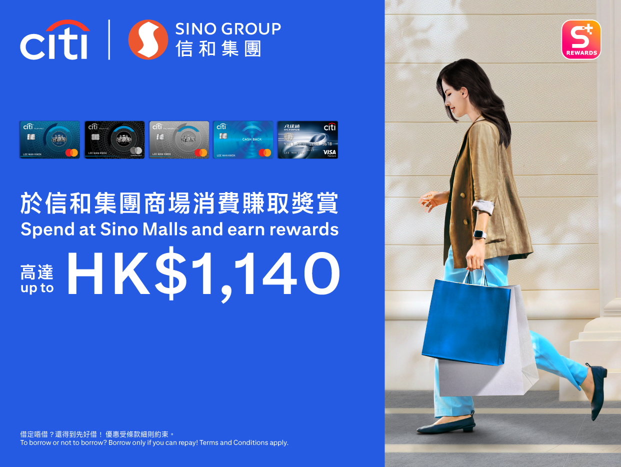 由2025年11月1日至12月31日,Citi信用卡客户于9大信和集团商场¹购物,即可尊享丰富奖赏!同日消费满HK$1,000或以上(最多两张收据)²,并于指定商场礼宾处成功登记点数,即可获得高达HK$1,140奖赏³。