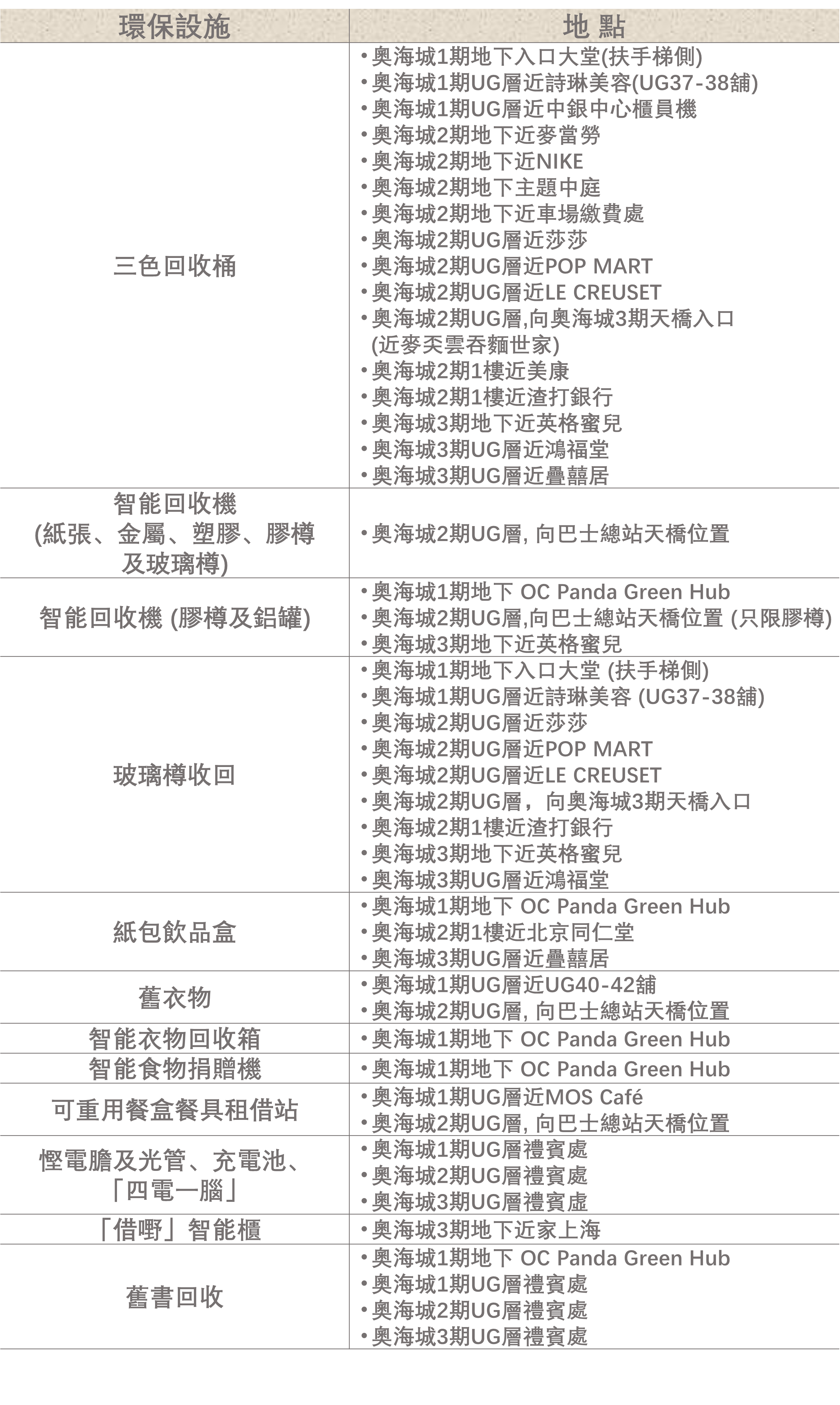 OC Panda Green Hub OC Panda Green Hub 是一個全新優化的綠色空間,以草地和大熊貓裝飾為特色,營造自然舒適的環境。這裡設有全新的漂書櫃及閱讀空間,鼓勵大家分享書籍。更會定期舉辦環保活動,提升社區的環保意識,推廣可持續發展的生活方式。 位置:奧海城1期地下