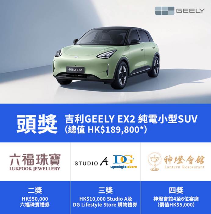 吉利GEELY EX2 純電小型SUV (價值HK$189,800*) |