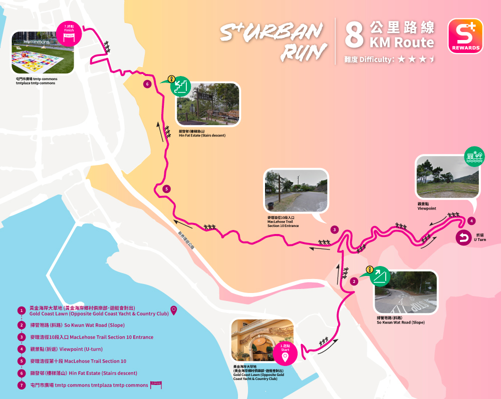 由黃金海岸商場起步,路線途經麥理浩徑第10段,沿途融合山野景致與城市視野,為跑手帶來截然不同的跑步體驗。完成下山路段返回市區後,參加者可於屯門市廣場享用清涼飲品及輕盈早餐,放鬆身心,為整個旅程畫上圓滿句號。